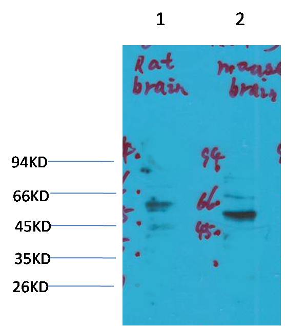Western blot analysis of 1) Rat Brain Tissue, 2)Mouse Brain Tissue with KV1.3 Rabbit pAb EA308 diluted at 1:2,000.