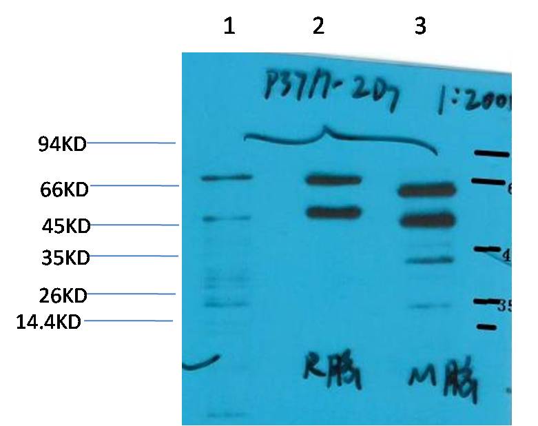 Western blot analysis of 1) Hela, 2)Rat Brain Tissue, 3) Mouse Brain Tissue with Phosphoserine Mouse mAb EM1189 diluted at 1:2,000.