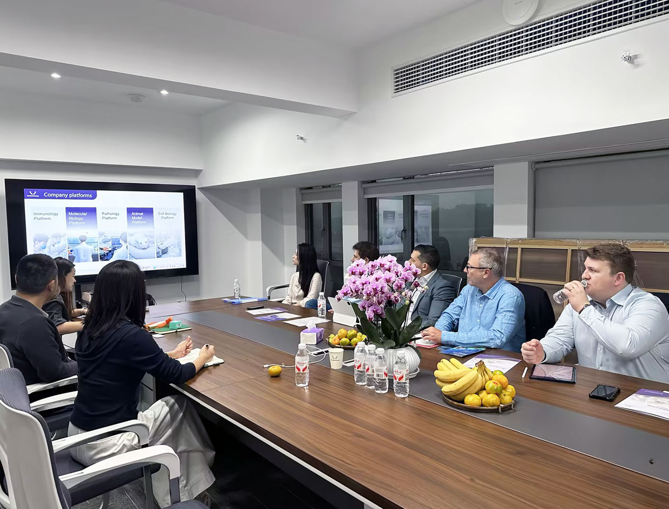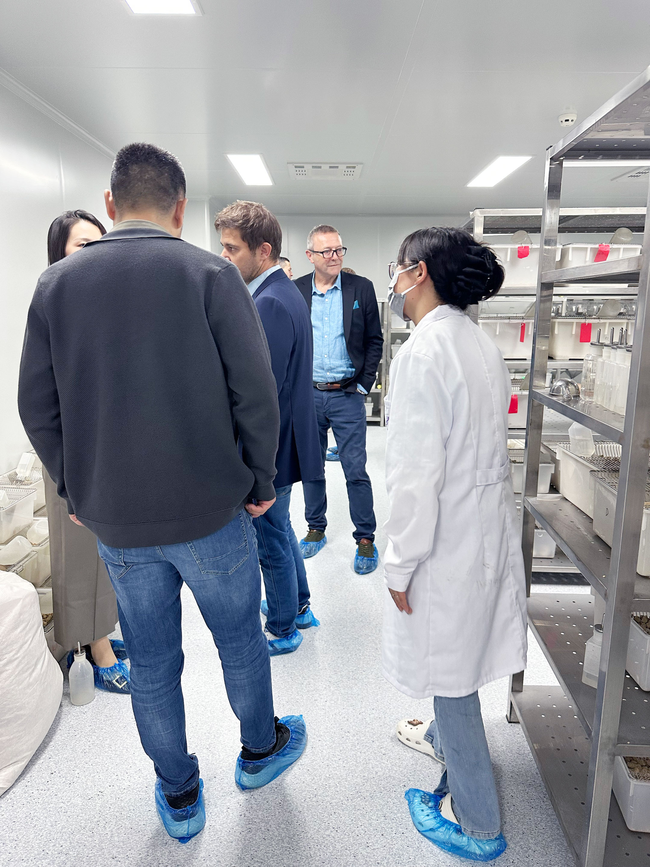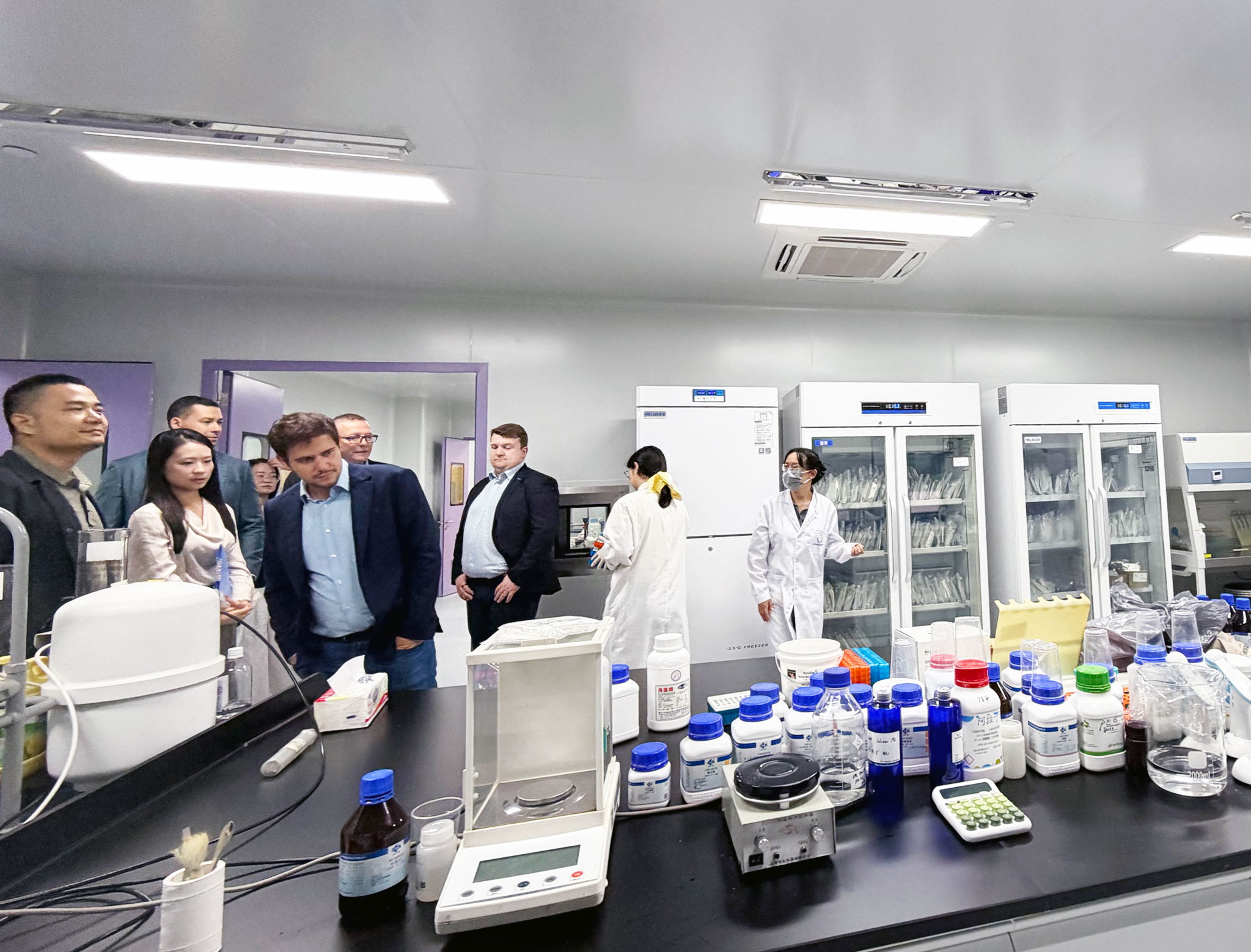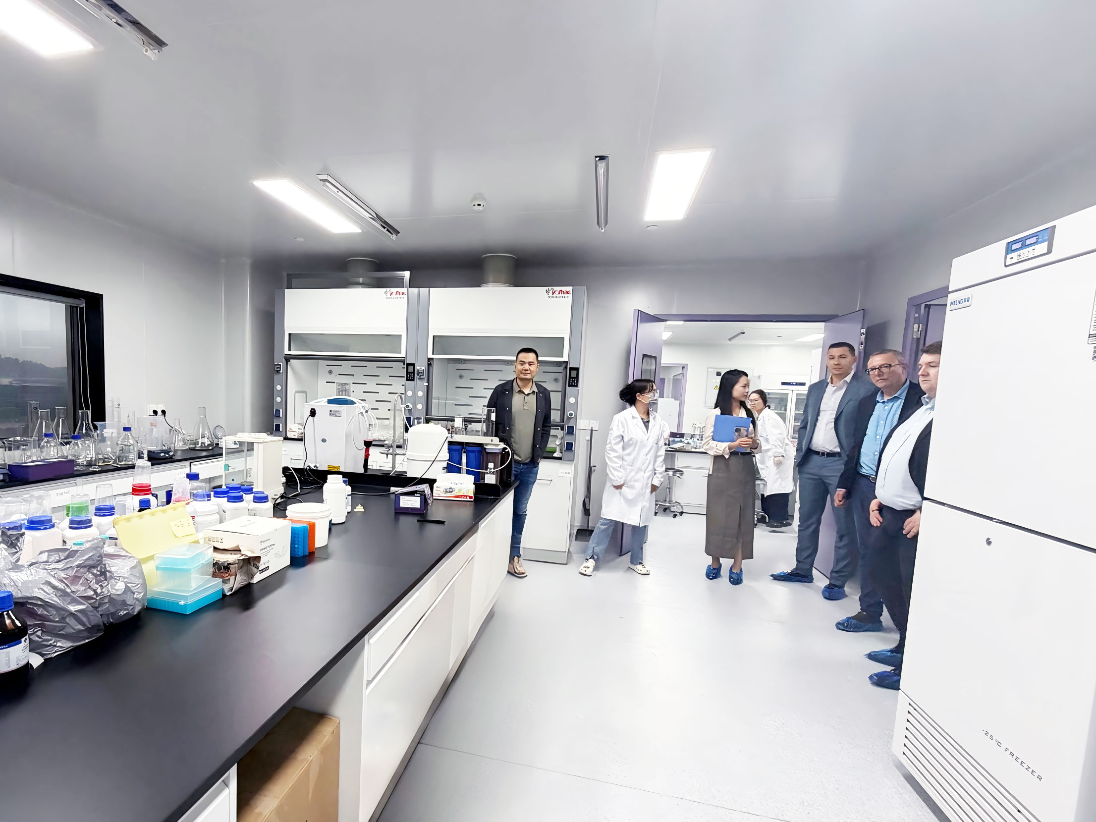 不久前,ELK 正式搬入這座規(guī)模宏大的 6000 平新實(shí)驗(yàn)室,此次客戶到訪,恰逢新實(shí)驗(yàn)室啟用后的首批客人拜訪,意義非凡。當(dāng)日,ELK的CEO夏總和銷售經(jīng)理早早便在大樓門口等候,以最誠(chéng)摯的熱情迎接了遠(yuǎn)道而來的客戶。此次到訪的客戶陣容強(qiáng)大,包括來自英國(guó)Pivotal Scientific的Tim、英國(guó)2BScientific的Will、美國(guó)ARP的Dan以及德國(guó)GeneTex的Jonas。他們的到來,為ELK 新實(shí)驗(yàn)室注入了國(guó)際化的活力與視野。剛一進(jìn)門,客戶們便感受到了家一般的溫暖,夏總和銷售經(jīng)理的熱情接待讓整個(gè)氛圍變得輕松而融洽。